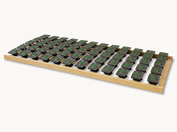 Un sommier à plots se compose de lattes ressorts et de plots. Chez allnatura, nous utilisons exclusivement des lattes ressorts galbées pour des raisons orthopédiques. Nos plots sont mobiles dans toutes les directions. Ils offrent un confort de couchage maximal.