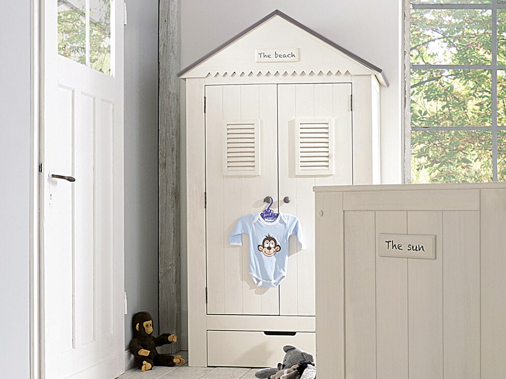 L’armoire chambre enfant « Sunny » attire tous les regards dans la chambre de bébé grâce à son toit original. De quoi faire souffler un air de vacances !
