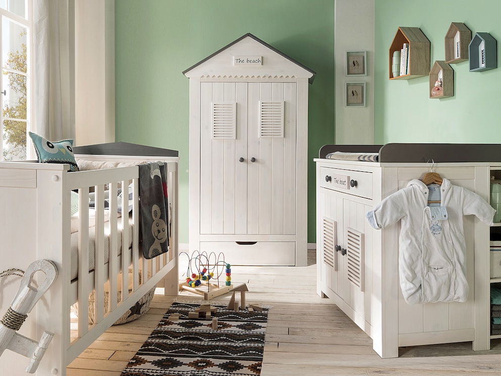 Le toit latéral rabattable offre un espace de rangement supplémentaire, sécurisé pour les tout-petits. Il se distingue discrètement du corps de l’armoire grâce à sa façade en saillie à bord cranté. Sur la façade du toit, comme sur la commode à langer et le lit bébé, se trouve une petite plaque – ici avec l’inscription « The beach ». L’agencement intérieur est adapté aux vêtements d’enfant. Le spacieux tiroir de plinthe avec prise en main ergonomique offre un espace de rangement supplémentaire. Particulièrement pratique : le tiroir est monté sur roulettes et peut donc être entièrement retiré. Idéal aussi pour les jouets !