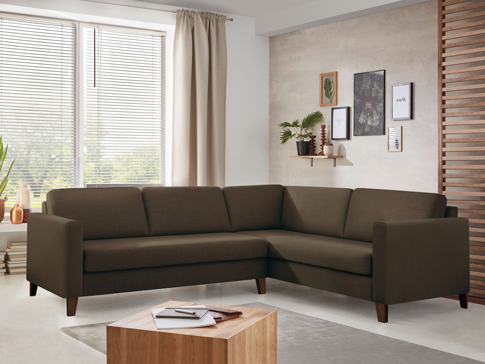 Afin d'adapter le canapé à vos goûts personnels, vous avez le choix entre plusieurs tissus d'ameublement de différentes couleurs ainsi que différentes variantes d'accoudoirs et de pieds. Fabriqué avec un soin artisanal et des matériaux de haute qualité, ce canapé d'angle durable allie taille, design et confort naturel.