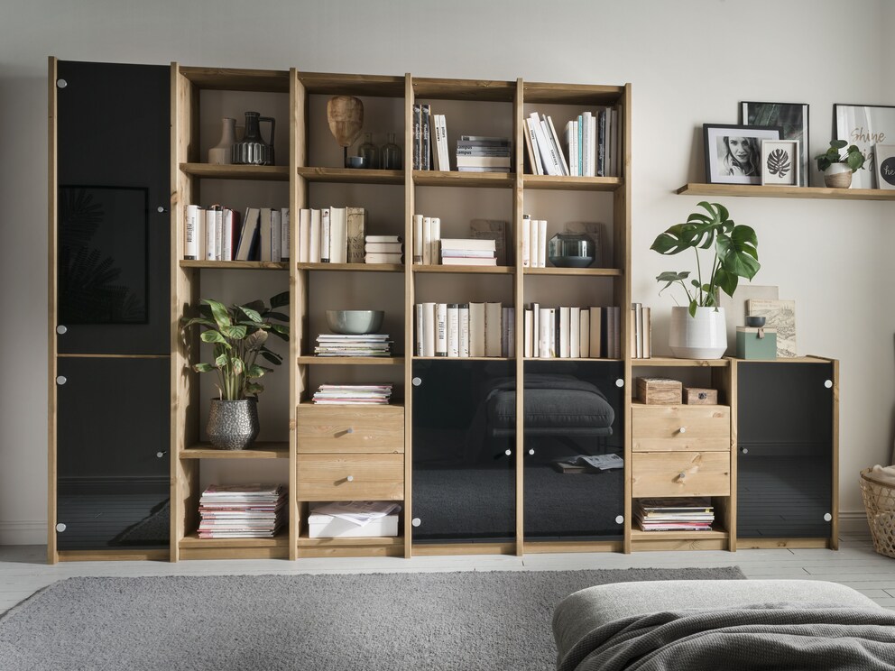 Elégante combinaison de pin massif (lessivé/huilé) avec portes vitrées sans cadre en noir et tiroirs