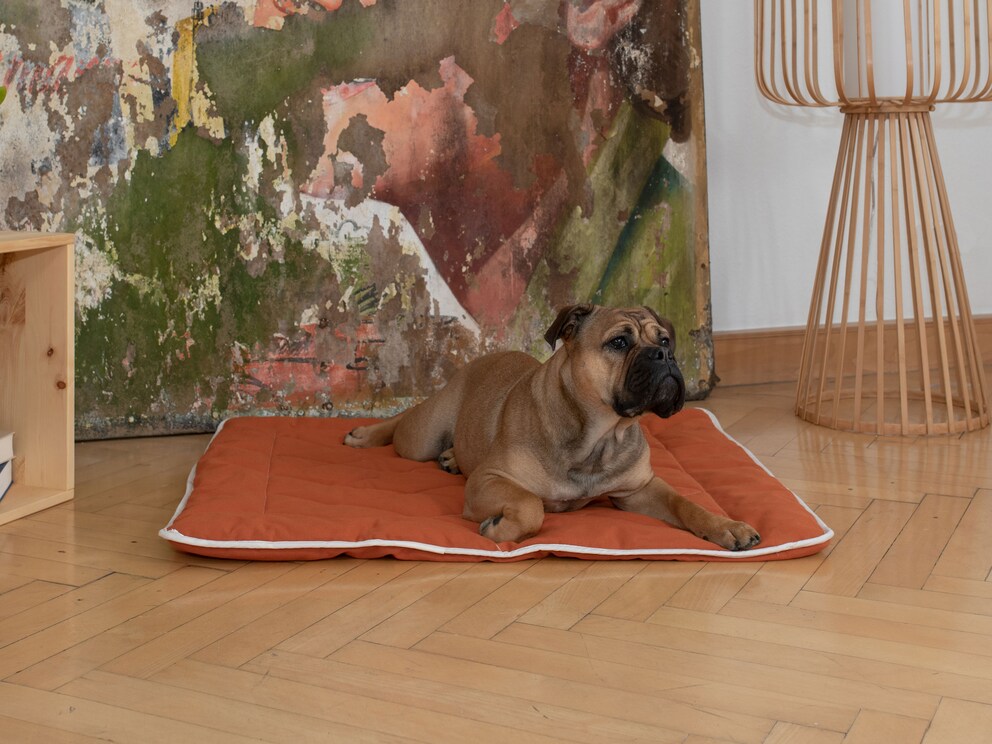 Cette couverture va ravir votre chien. Le garnissage en coton gonflant et kapok ou en lyocell résistant aux odeurs protège le ventre sensible de votre chien du froid du sol. Grâce au joli matelassage en losanges, le garnissage ne glisse pas, ce qui garantit un confort de couchage constant. Les callosités de couchage sont réduites et les matériaux testés contre les substances nocives enveloppent votre compagnon de douceur. « Estera » est disponible en 3 tailles et 6 coloris attrayants. Ainsi, du petit carlin au robuste rottweiler, chacun trouvera le couchage idéal pour des rêves de chien pleins d’aventures.