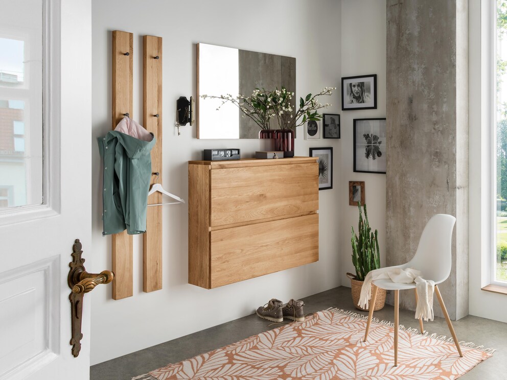 Le chêne sauvage massif est mis en valeur par un design épuré et sans poignées. Vous aimez les tendances ? Alors, le plateau en verre noir disponible en option pour le meuble à chaussures est fait pour vous. Une touche finale raffinée : l'éclairage LED périphérique du miroir, également disponible en option. Profitez chaque jour de votre comité d'accueil personnalisé