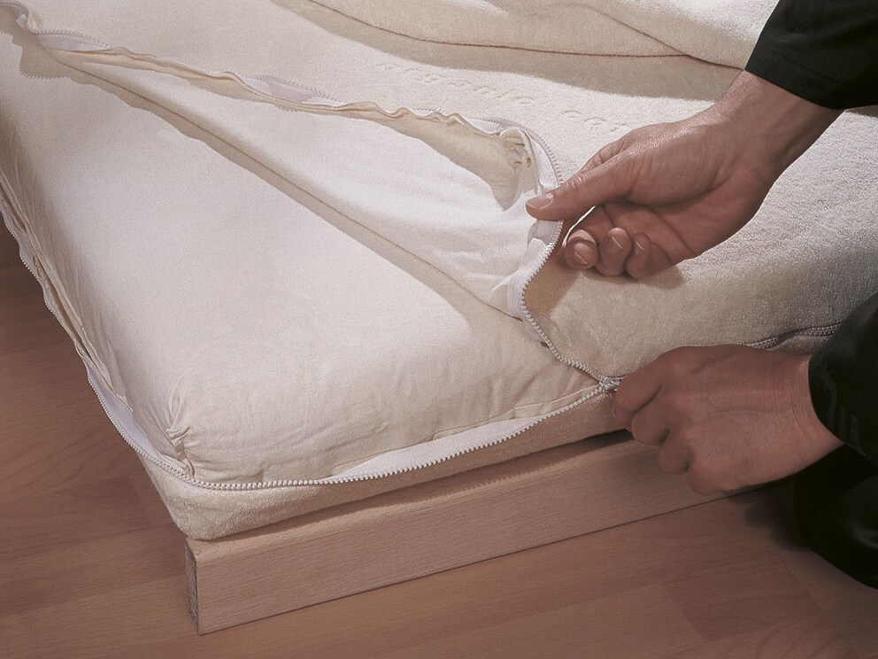 Housse en éponge-stretch de coton douce et facile d’entretien avec traitement anti-allergène, idéale comme housse supplémentaire pour tous les matelas en latex naturel, en mousse froide ou en viscoélastique d’une hauteur de noyau de 8 à 22 cm. Grâce à un procédé spécial d’extraction, le coton est débarrassé de ses substances accompagnatrices de fibres, dans lesquelles prolifèrent principalement les moisissures et les acariens. Aucun bactéricide ni fongicide n’est utilisé.