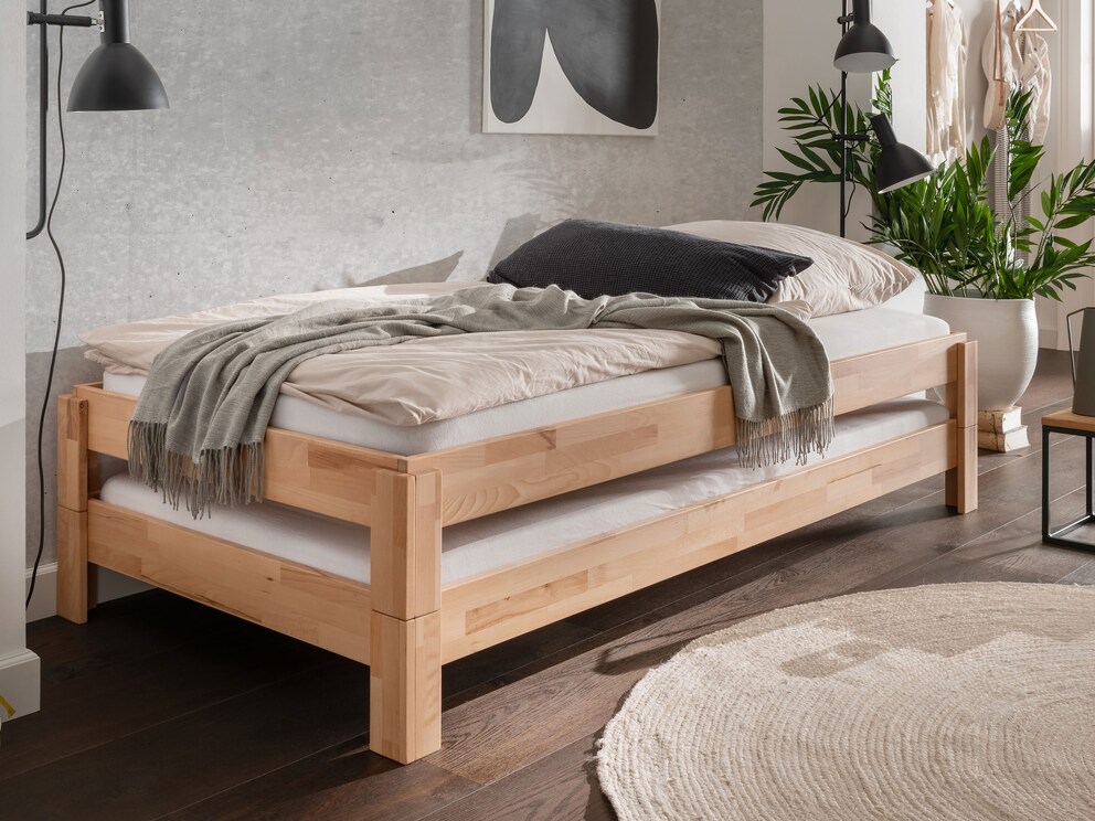 Le lit empilable est disponible en hêtre massif avec une finition huilée ou laquée blanche, ainsi qu'en chêne massif avec une finition huilée. Que ce soit comme lit individuel ou en pratique lot de 2, le lit empilable « Stiva » s'adapte avec flexibilité à vos besoins et convient parfaitement à une chambre d'ado.