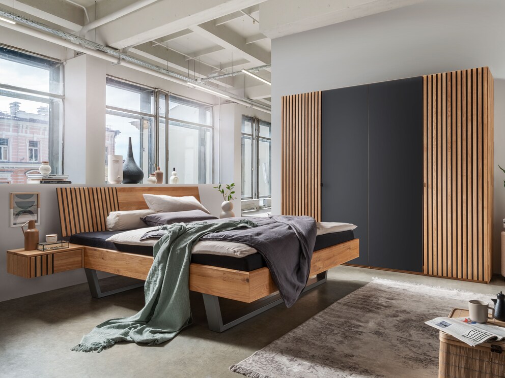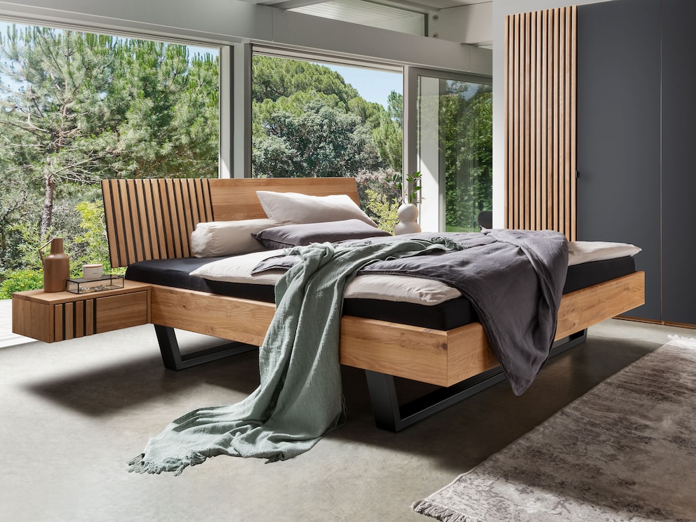 Le lit en bois massif en noble chêne sauvage séduit par son look panneau acoustique particulièrement élégant avec des lames fines sur fond sombre. Les imposants patins en bois assortis sont également teintés anthracite. Grâce à l'effet flottant, ils créent une atmosphère ouverte et aérée.