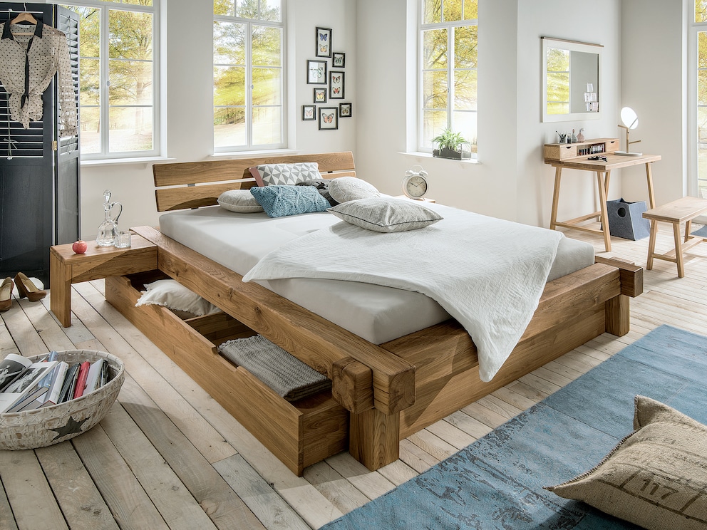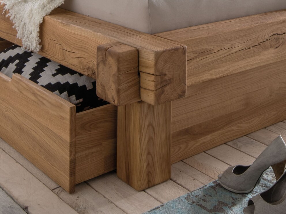 Le veinage unique du noble chêne sauvage fait de ce lit rangement massif un véritable accroche-regard incomparable dans votre chambre à coucher. « Viga » vous réserve encore un autre détail passionnant…