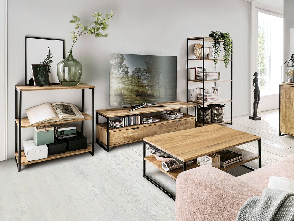 le bois de chêne sauvage au grain prononcé contraste avec l'acier noir froid. Le design minimaliste sans panneaux latéraux ni panneau arrière lui confère une grande légèreté et facilite le rangement des câbles. Les étagères sont évidées aux angles et visibles de l'extérieur. Elles semblent presque flotter dans le cadre. Choisissez entre 2 modèles ouverts de largeurs différentes et 1 modèle avec 2 tiroirs et un compartiment ouvert. « Anca » est disponible en exclusivité chez allnatura.