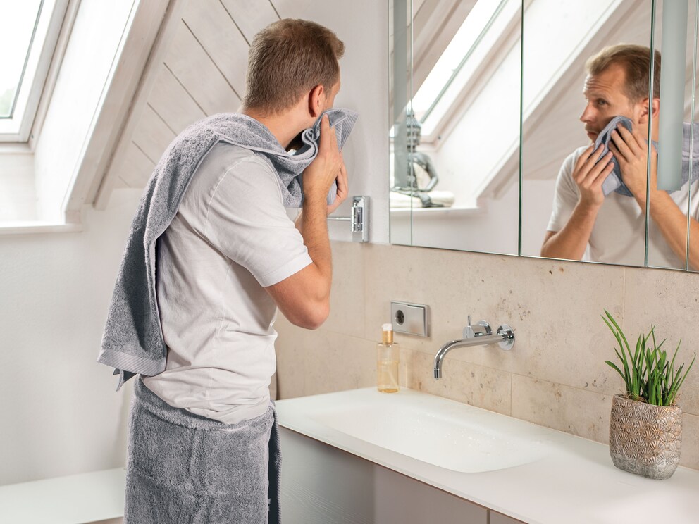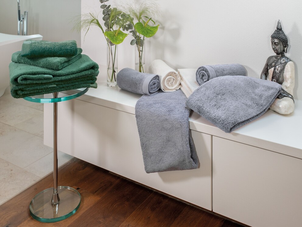Serviette de douche douce et moelleuse en qualité certifiée GOTS – ici en gris