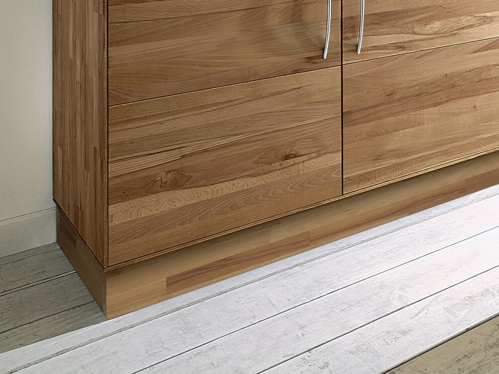 Cette plinthe massive complète parfaitement l’aspect chaleureux de votre cuisine de rêve « Culinara ». Choisissez simplement la plinthe adaptée à la largeur de votre module ou découpez la longueur souhaitée vous-même. Pour les modules de finition, nous recommandons également le panneau latéral pour un rendu parfait. La plinthe n’est pas seulement un atout esthétique – dites aussi enfin adieu aux « moutons de poussière » et au piège à miettes sous vos meubles de cuisine !