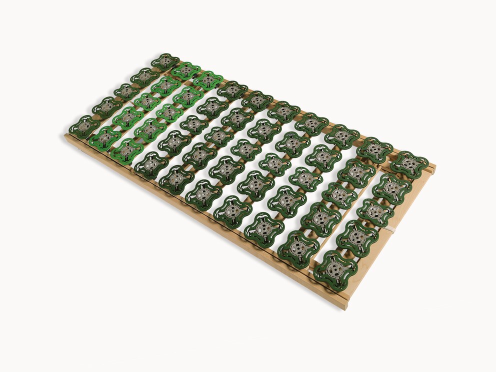 Les plots sont également montés sur des lattes de ressorts galbées. « Orthovita » cède ainsi individuellement à chaque point d’appui du corps en fonction de la pression exercée, de sorte que vous ressentirez une sensation de couchage presque flottante. Les propriétés de couchage ponctuellement élastiques de votre matelas haut de gamme sont ainsi activement soutenues. Ce sommier à plots est donc idéal pour les personnes qui souhaitent un couchage particulièrement adapté à leur morphologie.