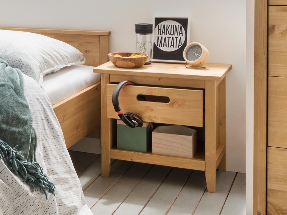 ...est la jolie table de nuit « Lucena ». Ce précieux allié est l’endroit idéal pour la lampe de chevet, le livre du soir & Cie. Dans le tiroir pratique, il reste encore beaucoup de place pour des objets importants mais peu décoratifs comme par exemple des médicaments ou des mouchoirs. Complément parfait et judicieux au lit individuel « Lucena ».