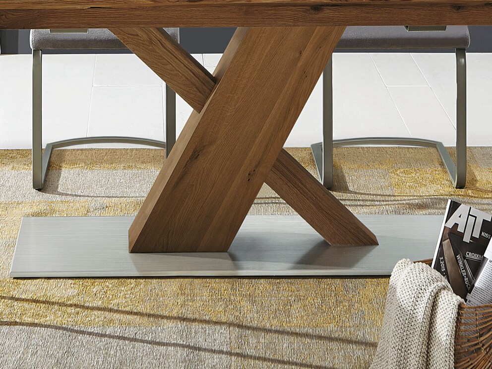 Cette table à colonnes attrayante attire automatiquement les regards admiratifs grâce à ses colonnes en forme de X disponibles en différentes épaisseurs de bois. Le bois massif noble et la plaque de base en métal thermolaqué gris argenté ou noir mat forment un mélange de matériaux astucieux. Cette table moderne est disponible en cœur de hêtre, en chêne sauvage élégant ou en noyer très raffiné.