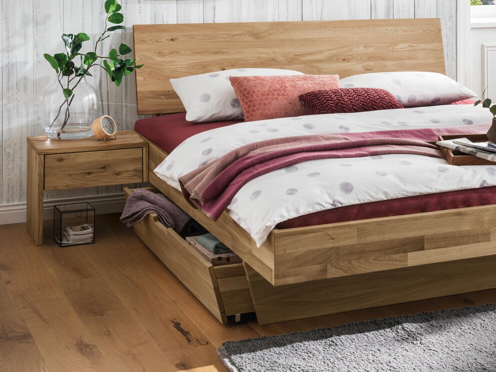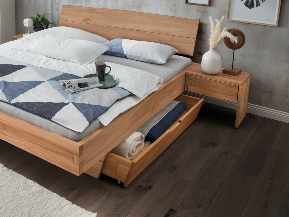 Ces tiroirs pratiques vous offrent un espace de rangement supplémentaire. Ils constituent ainsi le complément idéal des lits flottants présentés ci-dessous. Le tiroir s'effile vers le bas et suit ainsi la ligne des pieds de ces modèles de lit. Assortis aux lits, les tiroirs sont également disponibles en cœur de hêtre ou en chêne sauvage. À partir d'une largeur de lit de 160 cm, vous pouvez également insérer 2 tiroirs selon vos besoins.