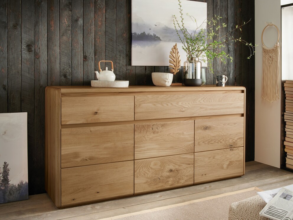 Passend bij de heldere vorm van de korpus, hebben de fronten een glad design. De deuren en laden openen met handgrepen en sluiten bijna geruisloos dankzij de ingebouwde soft-closing. Wij bieden dit huiselijke massief houten dressoir aan in 2 levendige houtsoorten. Zowel het elegante kernbeuken met zijn gebogen nerf als het markante, edel-rustieke wilde eikenhout hebben hun perfecte podium gevonden in dit nonchalante meubelstuk. Een echt juweel voor uw huis - als dressoir in de eetkamer of als elegante ladekast in de slaapkamer.