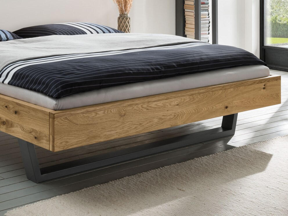 Kies dan gewoon voor de lounger zonder hoofdeinde. Het volledig onopvallende frame meet een trotse 4 cm en wordt ondersteund door twee gemarkeerde metalen sledepoten. De voorste, inspringende loper geeft het bed een bijna magische zwevende uitstraling. Dit fascinerende zwevende bed is verkrijgbaar in levendig kernbeuken of edele wildeiken. Maar wat u ook beslist - als u van rustieke massief houten meubelen houdt, zult u van "Legna" houden!