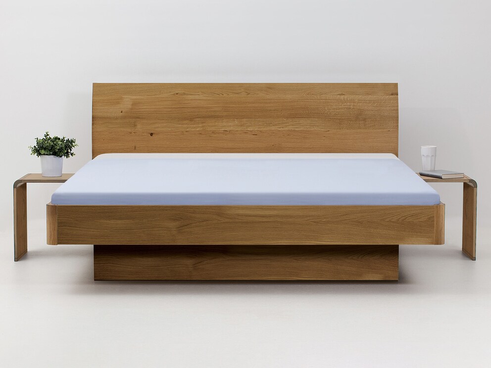 Elegant zwevend bed met comfortabel gebogen hoofdeinde, hier in massief notenhout