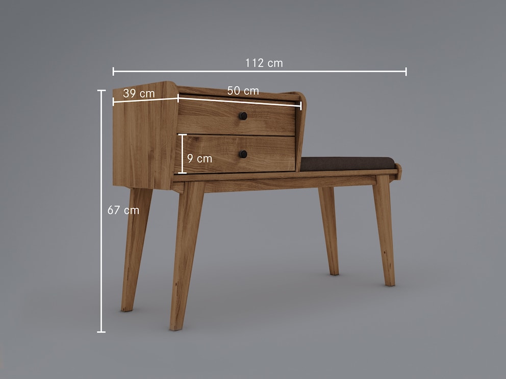 Variant 01 met ladekastje geïntegreerd in de zijkant is ook geschikt als comfortabel telefoontafeltje. Neem een comfortabele stoel terwijl je belt. In de twee lades is voldoende ruimte voor uw adresboek, schrijfgerei en al het andere dat u bij de hand wilt hebben. Variant 02 biedt ruimte in een ruime lade - voor uw lievelingsschoenen, bijvoorbeeld. U kunt kiezen tussen "Lasala" in massief beuken kernhout of wild eiken. U kunt kiezen uit 3 gezellige kleuren voor de elegante linnen bekleding.