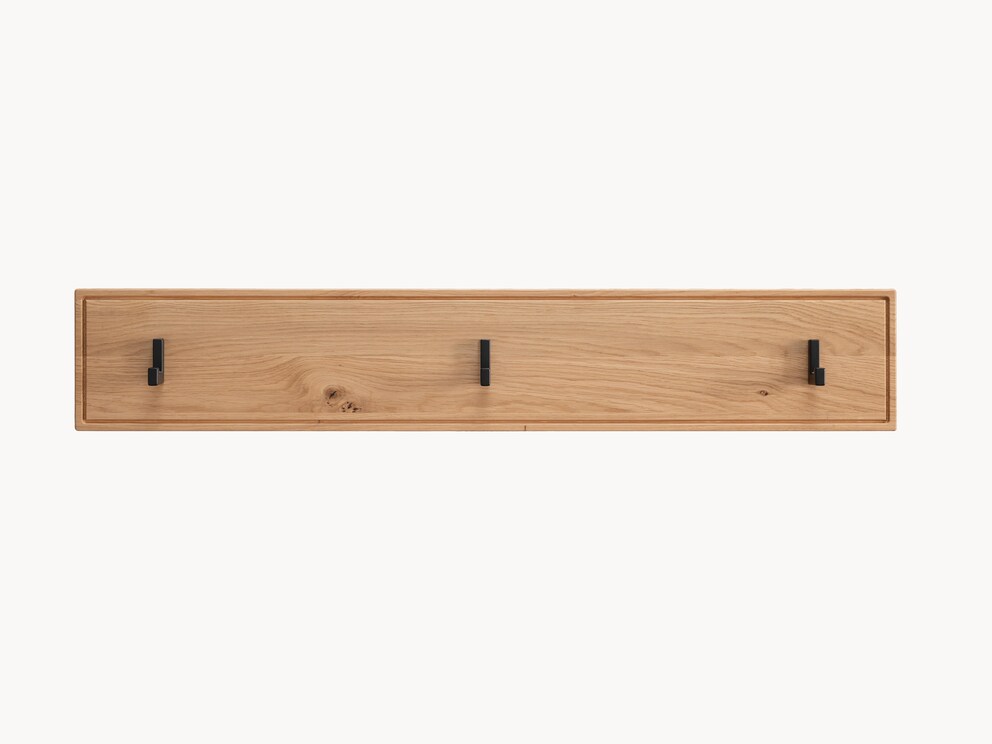 Het hakenrek "Fiella" combineert een mooi design met functionele elegantie. Het karakteristieke massieve wildeiken vormt samen met de hoekige kapstokken van zwart metaal een tijdloze materiaalmix die stijl en orde in uw hal combineert. Een bijzonder detail is de fijn gefreesde siergroef aan de rand van de achterwand, die het meubelstuk een elegante toets geeft.