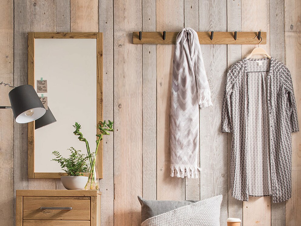 Uw podium: in de badkamer als handdoekenrek of in de slaapkamer als "hangende kapstok". 6 haken van gezwart metaal bieden voldoende ruimte voor uw ideeën! Het slanke wandpaneel is gemaakt van elegant kernbeuken of opvallend wildeiken. Uitgewerkte groeischeuren benadrukken vakkundig de intensieve oppervlaktestructuur en maken elk hakenrek ‘Locana’ uniek.