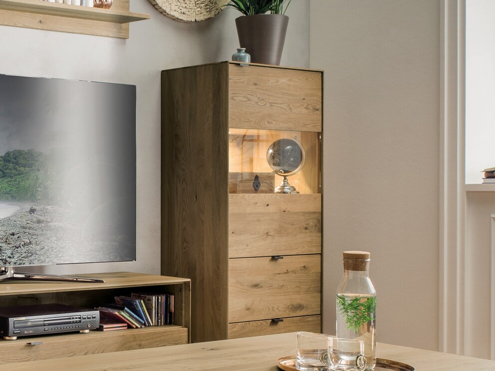De gemarkeerde, zwarte metalen handgrepen op deuren en laden! Bovendien doet het grote houten oppervlak het massieve hout vakkundig uitkomen en trekt het bewonderende blikken aan. De platte houten poten zorgen voor een elegante optische lichtheid van dit massieve meubel. Variant 01 biedt u 2 ruime laden onderin. Bovenaan zorgt 1 kastvak met glazen inleg voor voldoende ruimte. De bredere versie 02 biedt nog meer opbergruimte voor serviesgoed, glazen etc. Zet uw favoriete stukken in het juiste licht achter de glasplaat met de verlichte versie en zet ze vakkundig in het middelpunt.