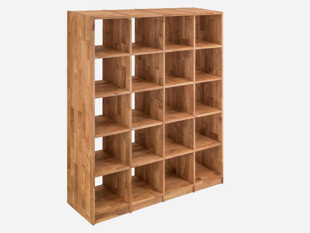 U kunt uw gewenste rek van massief wild eikenhout samenstellen uit 5 verschillende breedtes en 4 verschillende hoogtes. Door het eenvoudige ontwerp en de strakke lijnen past het rek in de meest uiteenlopende woonstijlen. De aanvullende accessoires bieden u nog meer mogelijkheden om het rekkensysteem perfect aan te passen aan uw wensen en behoeften. Kies uit fraai vormgegeven glazen of houten deuren en bijpassende laden.