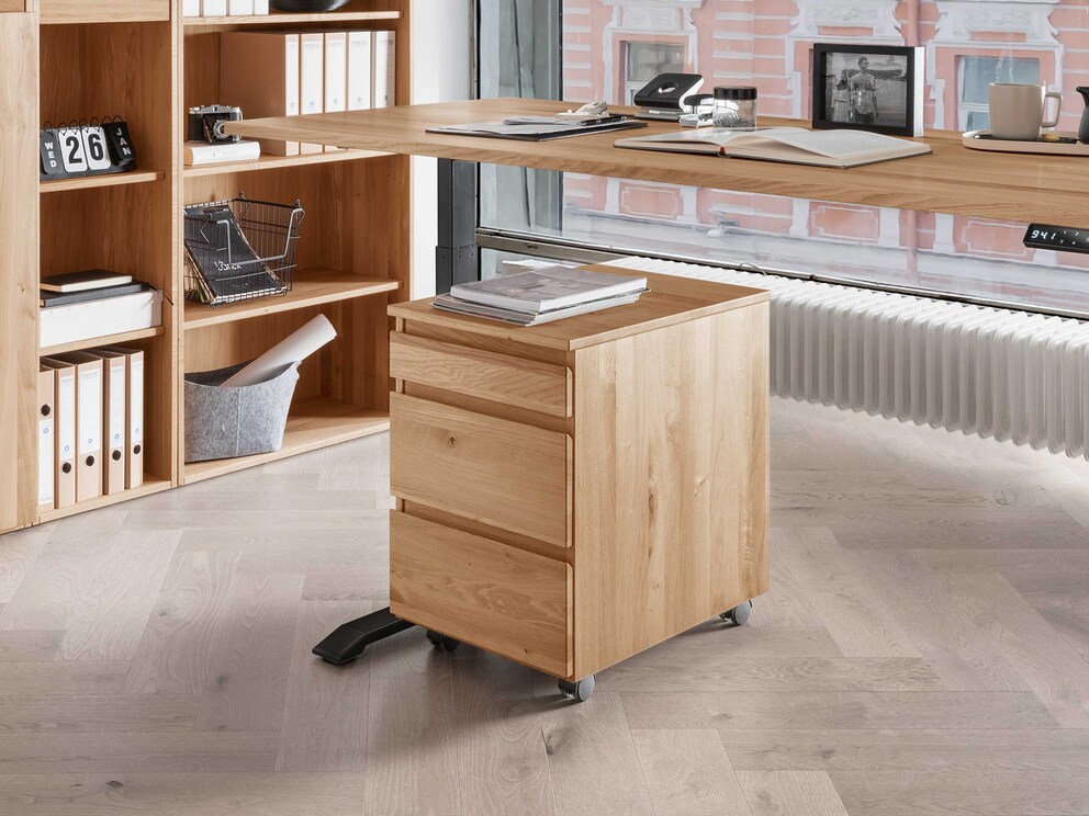 De rolcontainer “Rivana” vult de werkomgeving aan met functionele orde en een natuurlijke uitstraling. Massief wildeikenhout met een warme nerf brengt rust in de ruimte en creëert een aangename sfeer om geconcentreerd te kunnen werken. Soepel lopende laden met gedeeltelijke uittrek bieden overzichtelijke ruimte voor documenten en kantoorbenodigdheden. Dankzij de stabiele wieltjes blijft de container flexibel inzetbaar en altijd binnen handbereik. Met zorg en vakmanschap vervaardigd in Duitsland – voor een harmonieus totaalbeeld in het kantoor.