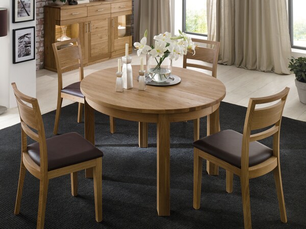 Eettafels van massief grenen, beuken, kernbeuken, eiken, wilde eik, noten of met een edel, wit geglazuurd massief houten blad. Het oppervlak wordt geolied of beschermd met een combinatie van olie en was.