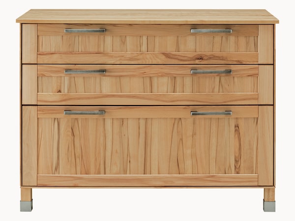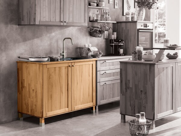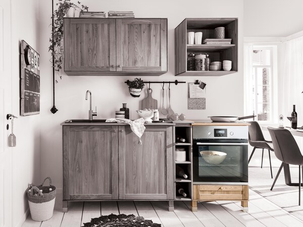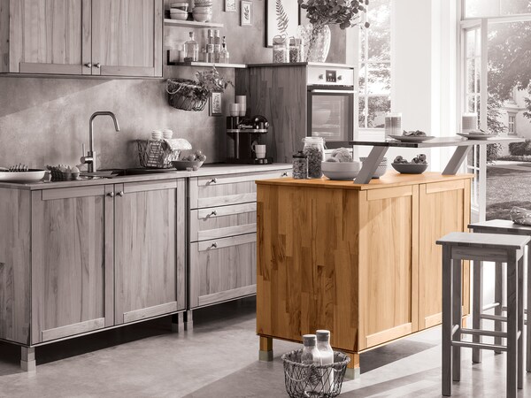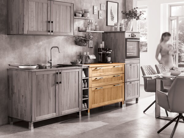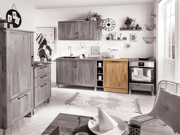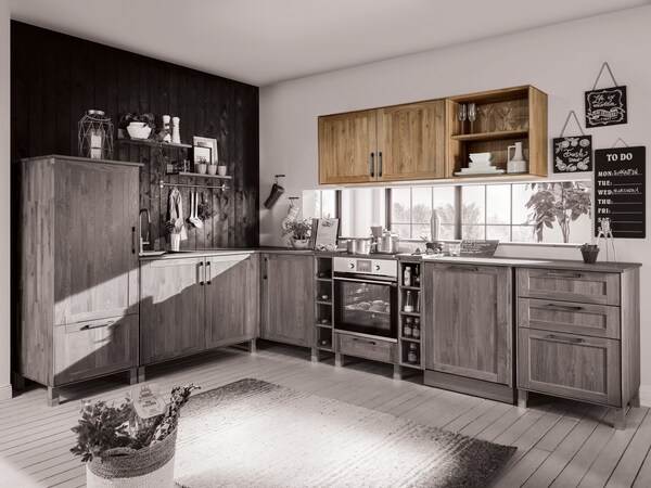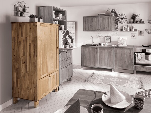 Stel uw eigen droomkeuken samen met de doordachte modules « Mediterano ». De nauwkeurig afgewerkte fronten in aantrekkelijke cassette-look toveren dankzij de populaire landelijke stijl een mediterrane sfeer in uw keuken. Verander het uiterlijk met ronde of vierkante metalen grepen in trendy used-look. Of verander het uiterlijk met metalen beschermstukken of een hoogwaardige houten sokkel. Uw fantasie kent geen grenzen.