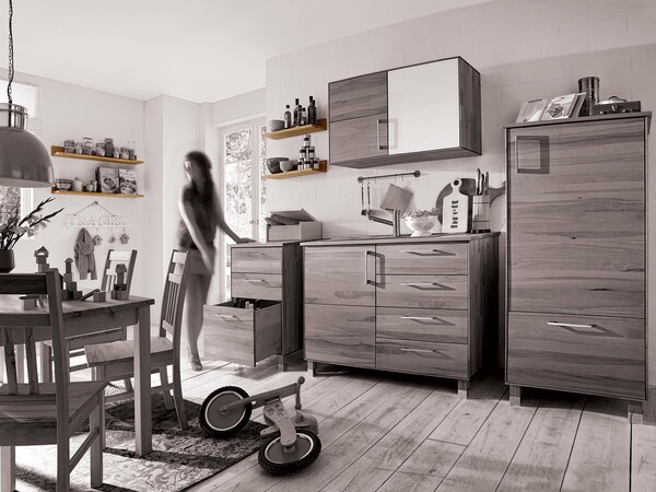 Natuurlijk werkt deze fijnafstemming ook bij massief houten keuken "Culinara". Wilt u het moderne, heldere karakter benadrukken? Greeploze fronten met tip-on-functie en houten poten onderstrepen het minimalistische design. Neigt u naar de industriële stijl, dan passen hoekige grepen en metalen manchetten voor de houten poten. Klassiek elegant wordt uw keuken "Culinara" met gebogen grepen en een sokkellijst.